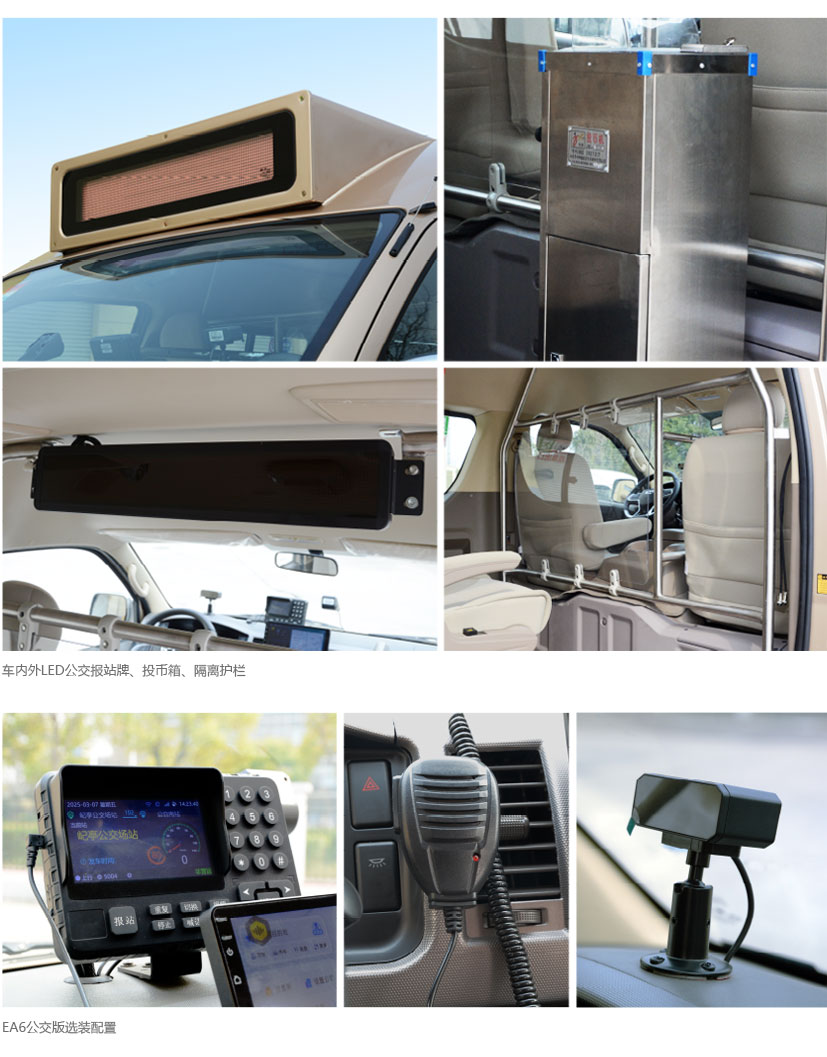 | 公交选装配置 | LED报站牌、驾驶员防护栏、乘客区单人座前护栏、投币机 | |||