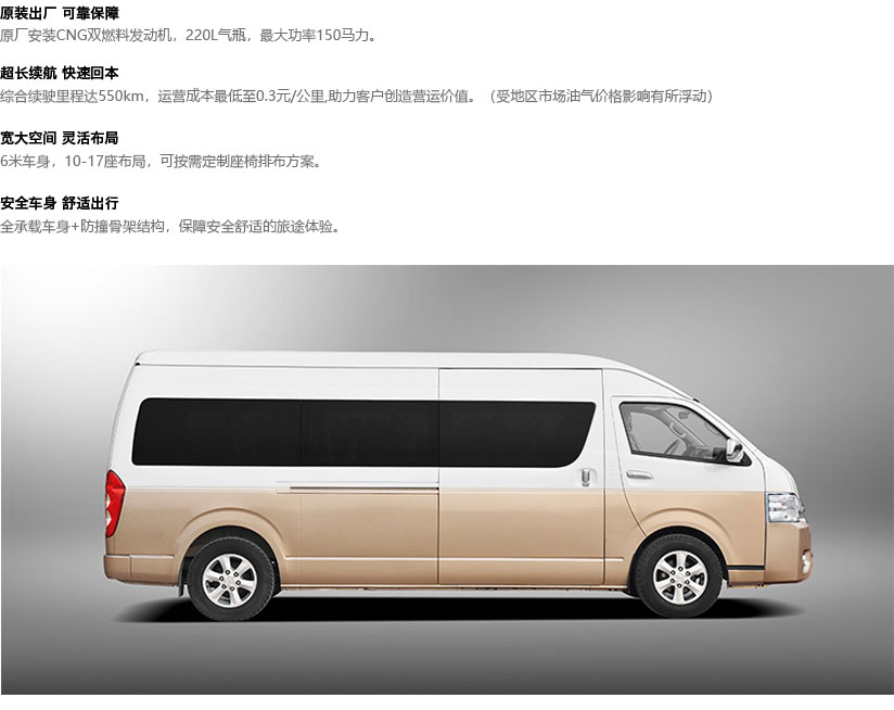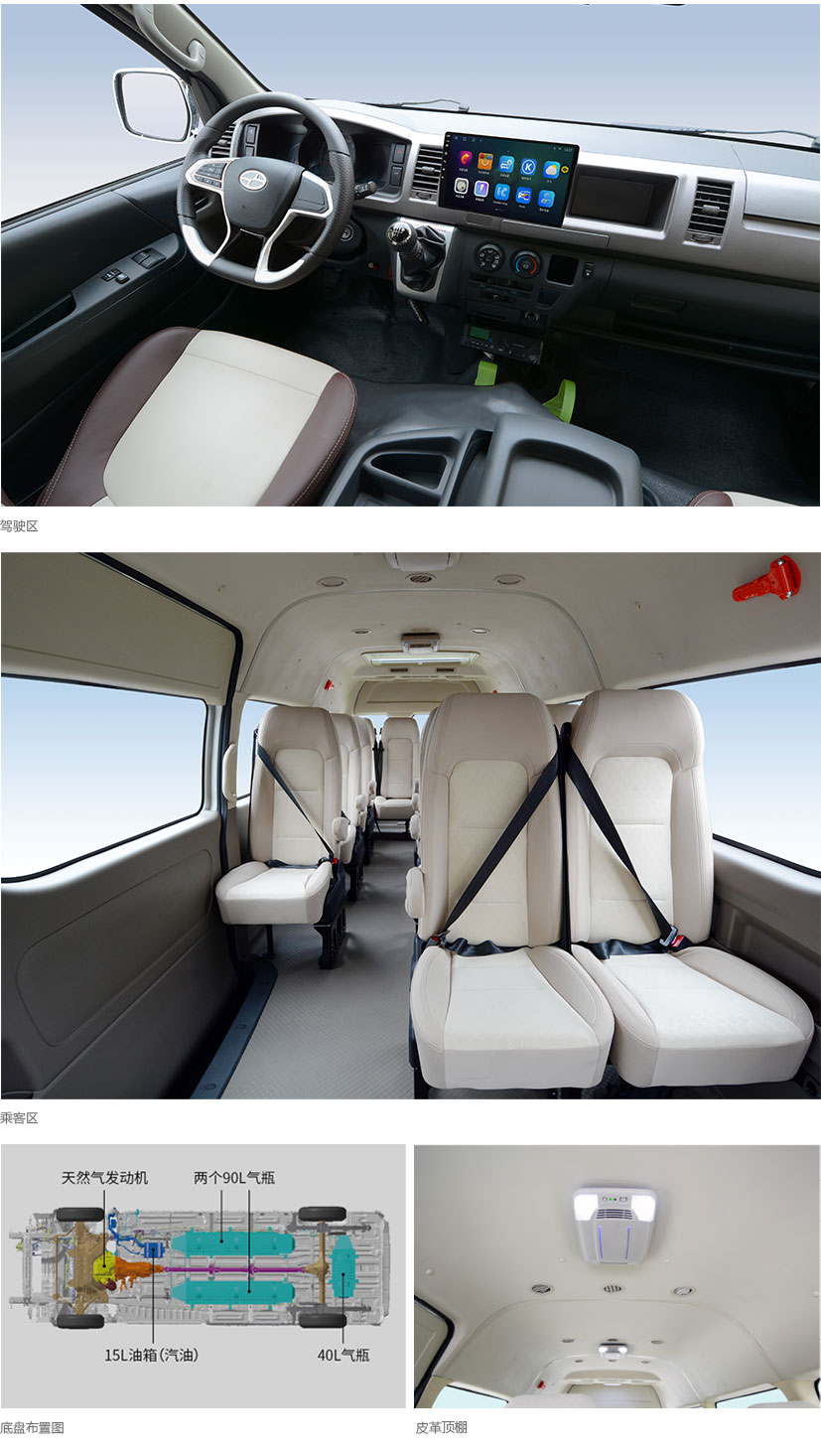 | 营运选装配置 | 视频监控+车载终端(含行车记录仪)、蓝牙麦克风、营运安全锤+自动破玻器、乘客安全带佩戴提醒装置、胎压仪、行李架 |